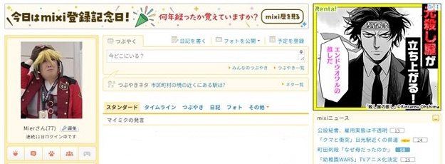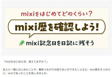 | 今日、mixiにログインしたら「今日はmixi登録記念日」と表示されて いました。mixiってこんなの表示されるようになったんだと思ったりします。