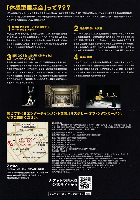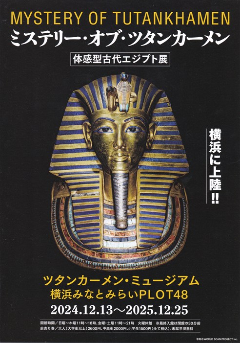 | 横浜みなとみらい、ツタンカーメン・ミュージアム(PLOT48)にて開催中の 「MYSTERY OF TUTANKHAMEN/ミステリー・オブ・ツタンカーメン 〜体感型古代エジプト展〜」(主催:合同会社ツタンカーメンプロジェクト)は、 2025年12月25日(木)までの期間限定の展覧会として開催をしておりましたが、 開催期間を設けない、常設の展覧会としての開催に変更いたします。 「MYSTERY OF TUTANKHAMEN/ミステリー・オブ・ツタンカーメン 〜体感型古代エジプト展〜」は、美術館や博物館を超えるイマーシブ空間で、 古代エジプトの世界を体感できる展覧会として、世界に3セットしか存在しない 130点余りのスーパーレプリカや、完全再現されたツタンカーメン王墓、 イマーシブなプロジェクション、実物の黄金のマスクや玉座から3Dスキャンした 映像など、アナログとデジタルを駆使し、没入感あふれる、非日常体験を お届けし、多くのお客様にご来場をいただいております。 常設展としての変更に伴い、より来場者に当展覧会を楽しんでいただけるよう、 コンテンツのリニューアルやイベントの開催を予定しておりますので詳細が 決まり次第、改めてお知らせをしてまいります。 ラムセス大王展も来年1月4日まで会期延長して驚いたのですが、 ミステリー・オブ・ツタンカーメンが常設の展覧会になるとは想像も つかなくて、本当に驚いています。あのスーパーレプリカ、あのまま横浜で ずっと展示していて良いのだろうかと思ったりもするのですが。 それでもまた見に行く機会は増えたので、良かったのかなという思いです。 これならまたいつか行けるかも、そんな気がします。 『ミステリー・オブ・ツタンカーメン〜体感型古代エジプト展~』 期間限定開催から常設の展覧会へ こちら | ||