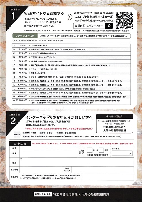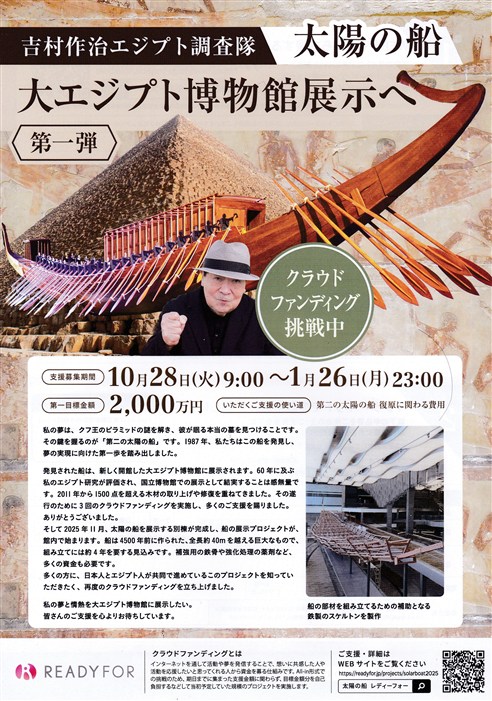 吉村作治 82歳の挑戦。 4カ年計画第一弾・太陽の船完成へ。 私の夢は、クフ王のピラミッドの謎を解明し、彼が眠る本当の墓を見つけること。 その鍵を握るのが、「第二の太陽の船」の復原です。第二の太陽の船は、 私たちの発見によって約4600年の永い眠りから解き放たれました。 2017年の第一弾クラウドファンディングにはじまり、2023年に第二弾、 2024年に第三弾と、皆さまからの多大なご支援をいただき、今日まで復原活動 を進めることができ、いよいよ第二の太陽の船の完成が見えてきています。 計画では、2029年いっぱいで完成する予定です。そのためには、総額8000万円 が必要だと見込まれています。これまでも全財産をなげうってでも挑む覚悟で 活動してきましたが、どうしても私たちだけの力では夢を叶えることが できません。皆さまも一緒に、この第二の太陽の船を、現代によみがえらせて みませんか?プロジェクトへのご参加をお待ちしております。 第二の太陽の船完成に向けた “4カ年計画” について 必要総額:8000万円 予定スケジュール: 第1フェーズ 〔2026年度(2026年1月~2026年12月)〕 組み立て復原その1:船体外板の取り付け 第2フェーズ 〔2027年度(2027年1月~2027年12月)〕 組み立て復原その2:船体梁桁の取り付け 第3フェーズ 〔2028年度(2028年1月~2028年12月)〕 組み立て復原その3:上部構造(甲板室など)の取り付け 第4フェーズ 〔2029年度(2029年1月~2029年12月)〕 組み立て復原その4:櫂の取り付け・船の完成 2023年のプロジェクトにて皆様からいただいたご寄付により、鉄製骨組みの 基本設計およびスケルトン部品の仮組み立てを完了することができました。 今回のクラウドファンディング(4ヵ年計画第一弾)では、第一目標金額を 第一フェーズに手数料・雑費等を加えた2000万円とし、皆様からいただいた ご支援金は木材を保存する薬剤の調達費用として使用させていただきます。 ※本プロジェクトは、期日までに集まった支援金額に関わらず、自己負担する などして当初予定していた規模のプロジェクトを実施します。 吉村作治さんのクラウドファンディングも4回目ですが、「第二の太陽の船」 の復原には、まだまだ多額のお金が必要なのですね。確かに復原も相当 大変だという話も聞いております。なので、今回も含めてこの先も クラウドファンディングが行われるかと思いますが、資金が集まって 「第二の太陽の船」が大エジプト博物館(GEM)で展示される日が来ることを 願っております。吉村さんと早稲田隊の皆様、頑張って頂きたいです。 吉村作治エジプト調査隊 太陽の船 大エジプト博物館展示へ【第一弾】 こちら |