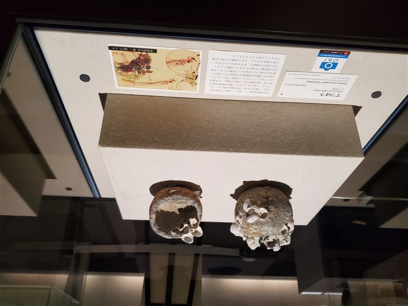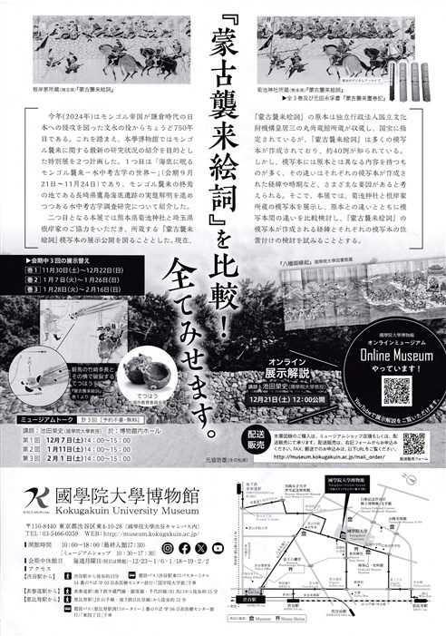 | てつはうの実物が展示されていました。実物が見れるって凄いですね。 実際に使われた物なので、壊れてはいますが。 あと、「本朝軍器考」、「馭戎慨言(ぎょじゅうがいげん)」、 「螢蠅抄(けいようしょう)」、「伏敵編」、「国威宣揚 元寇展図録」と いった本が展示されていました。 「蒙古襲来絵詞」は、竹崎季長の奮戦が描かれていますね。文字と絵が奇麗 です。一部で展示されていた物はパネルで展示されていますね。 あと、前回に引き続き、元軍船の模型もありました。 あとは、亀山天皇の「敵国降伏」の祈祷や元寇に際し、大将軍として 九州御家人達の指揮にあたり、父の資能や兄の経資と共に蒙古軍と戦った 少弐景資についても書いてありました。 前回に続いて、てつはうや元軍船の模型、「蒙古襲来絵詞」と 亀山天皇の「敵国降伏」の祈祷や少弐景資について書いてあったことが 良かったです。 文永の役750年 Part1 海底に眠るモンゴル襲来 ―水中考古学の世界― こちら | ||