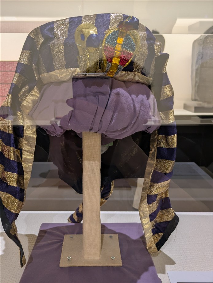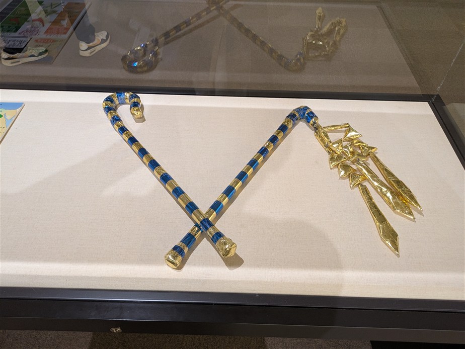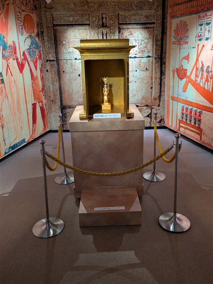 | それから、ファラオのヘカ杖とネケク笏やネメス頭巾が展示されていました。 と言っても子供がファラオになり切るためのイベント用に作られた物です。 それでもそこそこしっかりできていると思います。 ロゼッタストーンは、凄かったです。ヒエログリフ、デモティック、 ギリシア文字の3つの文字がびっしりでレプリカとはいえ圧巻です。 アルバムのエジプト柄は、ナルメルパレットからインスパイアされた ようですね。ナルメルパレットのレプリカもあって素晴らしかったです。 ハトホル女神に礼拝するホルエムヘブは、本で見たことありますね。 そのハトホル女神の形の栓抜きは、こんなのがあるんだと驚きました。 家具は、絵やヒエログリフが奇麗です。小襖は、綺麗で素晴らしいです。 あと、アニメや漫画に与えた影響として、ジャイアントロボ、 勇者ライディーンについての解説、王家の紋章の漫画の展示もありました。 それから、イギリスのバンド「ロゼッタストーン」のレコードの展示、 アビュドスやセティ1世葬祭殿の模型の展示もありました。 セティ1世葬祭殿のオシリス祠堂ですが、壁画のパネルがあり、中心に 祠堂があり、中にオシリス神像があるのですが、もう圧巻で素晴らしかった です。壁画や祠堂とセットのオシリス神像が本当に素晴らしかったです。 この展覧会に行ったら、この中は必見です。 神殿儀礼用道具、シストラムは、黄金で奇麗でした。香炉は、青銅で手の平の 上に容器のようなものが乗っていてそれが不思議でした。 今回は、昭和時代のエジプト柄の物を展示した展覧会という今までとはまた 違った視点からの展覧会で、昨年のはにわ展だと「ハニワと土偶の近代」に 近い位置付けの展覧会かなという思いです。昭和30(1955)年から 昭和40(1965)年あたりでこのようなエジプト柄が流行ったのだなと思い、 当時から古代エジプトは人々の関心を集めていたのだなという思いで、 とても興味深い展覧会でした。 | ||
