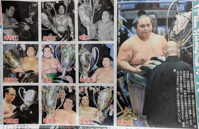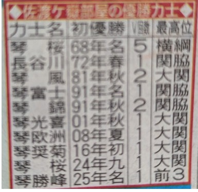 今場所は、11枚目の三田が優勝しました。6枚目の大青山、14枚目の荒篤山と