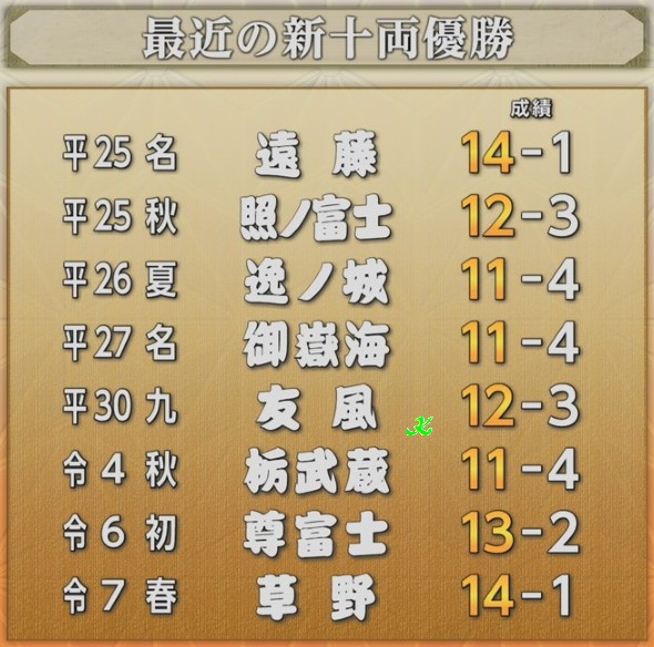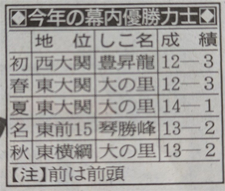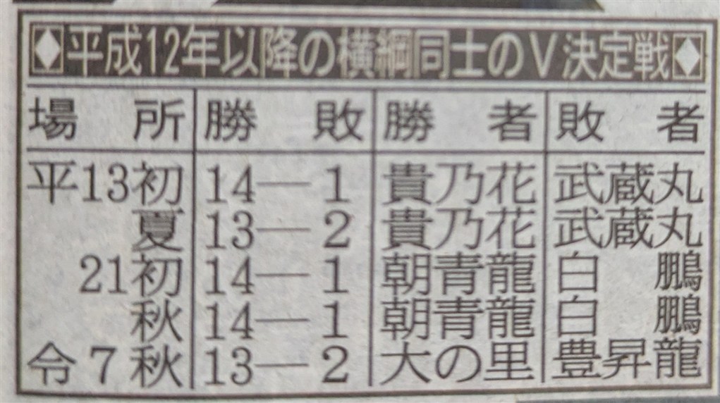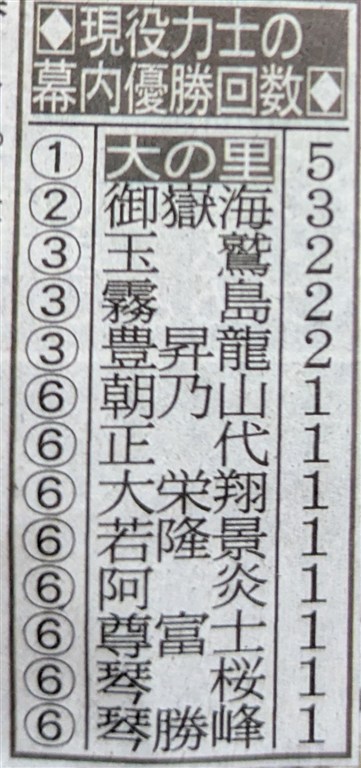 | ●幕内● 今場所は横綱の大の里が5回目の優勝をしました。今場所の優勝争いは 大の里と豊昇龍の両横綱を中心に争われ、横綱同士の千秋楽優勝争いは 令和になってからは3度目でした。本割は豊昇龍が勝ち、豊昇龍の勝ちへの 執念のすさまじさを感じました。優勝決定戦は、物言いが付く相撲の末、 大の里が勝ち、本当に面白い横綱同士の優勝争いだったと思います。 それが本来の姿なのですよね。豊昇龍は残念でしたが、それでも横綱としての 責任を果たしたと思いますし、今度こそ優勝をしてもらいたいものです。 大関の琴櫻は、攻める相撲が戻ってきて11日目で勝ち越したのは良かったです。 14日目から休場は残念でしたが、怪我を治して、また優勝争いに加わって もらいたいものです。大関取りを目指していた関脇の若隆景は6勝と負け越し。 関脇の霧島も6勝と負け越しで残念です。小結の高安は、6連敗してから 7勝したのは見事でした。 小結の安青錦は11勝ですが、新入幕から4場所連続で10勝以上は史上初と いうことで、快進撃が凄いですね。そして大関取りの起点も作りましたね。 来場所以降の活躍に期待&楽しみにしています。 2枚目の王鵬は上位で10勝と見事です。これで三役復帰ですかね。 2枚目の伯桜鵬も右腕を怪我しながらの8勝は頑張ったと思います。 三役昇進は微妙ですが、してくれたら嬉しいですね。4枚目の平戸海は 上位でよく頑張った感じがします。そんな8勝でしたね。 7枚目の隆の勝は、優勝争いもしての12勝は凄かったです。8枚目の宇良、 11枚目の正代、18枚目の獅司は10勝と健闘しましたね。16枚目の友風も 大怪我を抱えながらの幕内での勝ち越しは見事でした。 3枚目の豪ノ山は、1勝しかできませんでしたが、それでも終盤は攻める 相撲で頑張っていた印象があります。5枚目の琴勝峰は3勝とやはり優勝の 翌場所は大変でしたかね。また来場所以降、立て直してもらいたいと思います。 新入幕の17枚目の日翔志は負け越し、残念ですが、7勝は頑張りましたかね。 来場所ですが、関脇が安青錦、王鵬、小結が隆の勝、伯桜鵬。 平幕に陥落が、若隆景、霧島、高安。新入幕が欧勝海。 再入幕が千代翔馬、錦富士。十両に陥落が尊富士、明生、錦木と予想します。 ●十両● 今場所は、新十両の11枚目の朝白龍が優勝しました。先場所の幕下優勝に 続いての優勝で、これは本当に注目ですかね。今後が楽しみです。 優勝争いは、前半は4枚目の三田と8枚目の荒篤山が争っていましたが、 後半からは、朝白龍、13枚目の朝乃山、3枚目の錦富士の争いになって きましたね。朝白龍は13勝、朝乃山は12勝、錦富士は11勝と見事でした。 三田は9勝、荒篤山は9勝と後半に崩れたのが残念でした。 錦富士ですが、青森出身の幕内力士は、1883(明治16)年5月場所の一ノ矢 以来142年間途切れなかったのですが、尊富士の休場によって途切れるかも しれないと言われていましたが、錦富士が幕内に復帰しそうなので、 途切れることはなくなりましたね。良かったです。 筆頭の欧勝海は9勝で来場所の新入幕が楽しみですし、2枚目の千代翔馬も 9勝と勝てるようになってきて嬉しいです。 新十両の14枚目の西ノ龍は8勝で勝ち越しとまずまずな感じですね。 12枚目の朝翠龍は7勝、13枚目の旭海雄は6勝と負け越し、残念です。 来場所ですが、新十両は長村、五島。再十両は北の若、若ノ勝。 幕下に陥落は遠藤、宮乃風、宝富士、旭海雄と予想します。 紫雷は、東から西になるぐらいで残留すると予想します。 ●幕下● 今場所は、20枚目の島津海が優勝しました。それで来場所は十両復帰を 狙えそうですかね。また幕内に戻ってきてもらいたいものです。 筆頭の北の若は5勝、2枚目の長村は5勝、3枚目の若ノ勝は5勝、 5枚目の五島が6勝とこのあたりが十両に上がりそうですかね。 10枚目の聖白鵬、10枚目の伊波、15枚目の出羽ノ龍あたりは来場所十両を 狙えそうですかね。温かい目で見守っていきたいと思います。 31枚目の炎鵬は5勝で勝ち越し。また番付を上げていったもらいたいです。 ●三段目● 26枚目の一意(かずま)が優勝しました。一意は、令和6(2024)年7月場所で 幕下最下位格付け出しでデビューしましたが、この場所は休場して序ノ口 まで陥落しましたが、令和7(2025)年5月場所から復帰してからは快進撃で 今場所は三段目優勝しましたね。来場所からは幕下での活躍に期待しています。 地元の富山県出身力士でもありますが、23枚目の旭水野が6勝しました。 これは嬉しいです。来場所はいよいよ幕下ですね。さらなる活躍に期待 しています。富山県出身力士は、49枚目の富豊は3勝と負け越しで残念です。 74枚目の坂林は4勝と勝ち越しは良かったです。 ●引退● 元幕内の水戸龍、元関脇の宝富士が引退しました。 水戸龍は、幕内、十両で頑張っていたのが印象的でした。 宝富士ですが、初土俵からの通算連続出場回数が1398回(歴代6位)、 幕内連続出場が990回(歴代7位)ということで。関脇まで昇進して長く幕内で 活