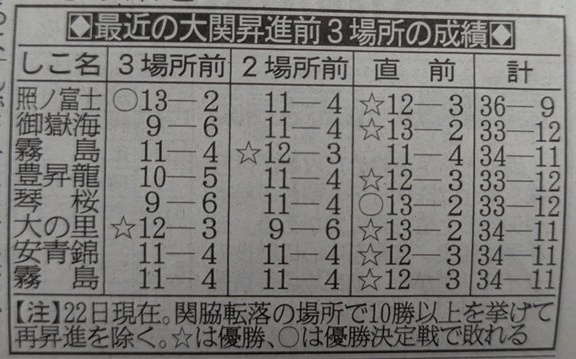 ●幕内● 今場所は、関脇の霧島が14場所ぶりに3度目の優勝をしました。14日目に 優勝争いをしている3人がそろって負けての優勝が決まるのは史上初と いうことで。千秋楽だったら平成27(2015)年の11月場所に同じようなことが ありましたね。ですが、この3場所の霧島は、強さが際立っていましたし、 大関復帰の濃厚で嬉しい限りです。霧島の娘さんが優勝のバンザイをやりたい から優勝して欲しいと言われていましたが、叶えられて良かったです。 優勝争いは、4枚目の隆の勝、5枚目の琴勝峰、10枚目の豪ノ山あたりが 争いましたね。 横綱の大の里は休場、大関の安青錦は綱取りでしたが、負けが込んで7勝と 負け越し、来場所はカド番となりました。大の里も安青錦も今まで順調過ぎた ということで、このような壁にぶつかった経験も大事で、勉強の場所に なったのではないかと思います。またこれを乗り越えてさらに強い力士に なってもらいたいと思います。 大関の琴櫻ですが、令和6(2024)年11月場所以来の2桁勝利となりましたが、 ここまで力強い相撲を取れるのならもっと勝って優勝争いに絡めないかなと 思ったりもしますが、今後に期待しています。10勝は嬉しいです。 新小結の熱海富士が9勝と勝ち越したのは見事です。2枚目の藤ノ川も初の 上位総当たりで8勝は見事です。あとは、14枚目の千代翔馬、16枚目の朝白龍 が10勝と健闘しましたね。 9枚目の玉鷲ですが、4日目に幕内出場回数通算1471回となり、単独史上1位 となり、現時点で1482回となりました。幕内勝利数は、千秋楽で日馬富士と 並ぶ史上8位の712勝となりました。凄い記録をどんどん作りますね。 関脇の高安は、後半に崩れての負け越しは残念です。筆頭の義ノ富士、 2枚目の美ノ海もはね返されましたが、また立て直して頑張ってもらいたいと 思います。今場所は勉強の場所だったように思えます。 新入幕の13枚目の藤青雲は10勝、再入幕の17枚目の琴栄峰は9勝と勝ち越した のは嬉しいです。新入幕の17枚目の藤凌駕は負け越し、残念です。 来場所ですが、霧島が大関に昇進。関脇は熱海富士、若隆景。 小結は高安、藤ノ川。平幕に陥落は若元春。新入幕は若ノ勝。再入幕は竜電。 十両に陥落は、翠富士、藤凌駕と予想します。 ですが、高安は、関脇残留も考えられそうですね。 ●十両● 今場所は、10枚目の出羽ノ龍が優勝しました。今場所は、3枚目の若ノ勝、 11枚目の一意、14枚目の風賢央が優勝争いをしましたね。そして、若ノ勝との 優勝決定戦を制しました。出羽ノ龍、一意、風賢央は、幕内を目指して もらいたいですね。そして、若ノ勝はいよいよ幕内ですね。 あと、9枚目の羽出山も10勝と来場所は再入幕を狙えそうですかね。 12枚目の剣翔ですが、15戦全敗となりました。十両力士の全敗は 令和2(2020)年11月場所の富士東以来約6年ぶり。関取としては、幕内で 全敗した令和4(2022)年11月場所の照強以来約4年ぶりということで 左膝の怪我を抱えての相撲でしたが、千秋楽まで休まずに相撲を取り切ったのは よく頑張ったと思いますし、不名誉な記録かもしれませんが、これも勲章、 敢闘賞ものではないでしょうか。 新十両は、11枚目の寿ノ富士は10勝と良い感じですね。13枚目の藤天晴は、 5勝。5日目から崩れたのが残念です。また再十両を目指して頑張って もらいたいです。 来場所ですが、新十両が大花竜。再十両が栃大海、白鷹山、炎鵬。 幕下に陥落は、剣翔、島津海、藤天晴、荒篤山と予想します。 ●幕下● 今場所は、28枚目の和歌ノ富士が優勝しました。三段目の生田目が下の 幕下の全勝力士を蹴散らして、6番相撲が終わった時点で全勝が和歌ノ富士 1人になったのでどうなるかと思いましたが、7戦全勝で良かったです。 2場所目での優勝は今後注目ですかね。「1年後には幕内に」という目標を 言っておられましたが、1年後にそうなっていることを願います。 幕下上位は、筆頭の栃大海、2枚目の白鷹山、3枚目の貴健斗、4枚目の炎鵬 が勝ち越して、十両昇進はどうなりますかね?あと、7枚目の嵐富士が5勝、 10枚目の豪刃雄が5勝、17枚目の大皇翔が6勝とこのあたりが十両を狙えそう ですかね。12枚目の北天海の4勝もいい感じに上がりそうですかね。 今まで順調に番付を上げてきた11枚目の可貴は、1勝とはね返されましたね。 また体勢を立て直して頑張ってもらいたいです。 幕下最下位格付出の不動豊は4勝で勝ち越しでした。 ●三段目● 今場所は、3枚目の元十両・生田目が優勝しました。21枚目の豊雅将との 優勝決定戦を制しました。ですが、生田目は幕下の全勝力士を次々と 蹴散らしていったのは凄かったですし、いよいよ復活してきましたね。 また関取復帰を目指して頑張ってもらいたいです。 32枚目の元十両・大雷童は、自身初めての初日から6連敗して7番相撲で 1勝を挙あげましたが、「こんな経験ができて、相撲は改めて面白いと 思いました。体をつくって出直します」と言っておられました。 辛かったとは思いますが、