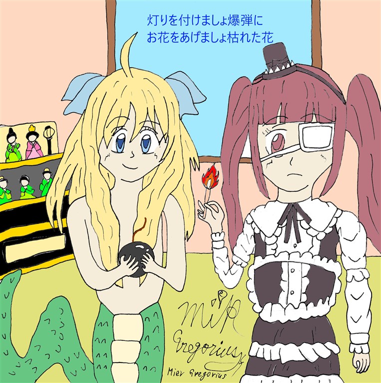 このイラストは、昨年3月の第6回お絵かきオフ会の時ですが、 最初は「ひな祭り」でくるかと予想していてその時に用意していたネタが このイラストです。それを今回は形にしましたということで。 「ひな祭り」と言えば、童謡の「うれしいひなまつり」の替え歌の 「灯りを付けましょ爆弾に お花をあげましょ枯れた花」のフレーズが 思い浮かんだので、邪神ちゃんが爆弾を持って、ゆりねちゃんが火をつける 場面をイラストにしようと思いました。 ですが、書いているうちに、なんか邪神ちゃんとゆりねちゃんのイラストに 凄く力を入れてしまいました。あと、邪神ちゃんの表情も無表情にしようと 思っていたのですが、微笑ませた方が良いかなと思い、そのようにしました。 お気に入りの一枚ですが、こんなネタなので、笑ってやって下さい。 |