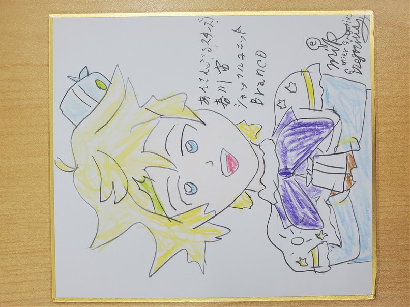 今回の色紙へのイラストですが、実はお題は聞いてなかったので 分からなかったのですが、「クリスマス」かなと思って、ふとネタが 思い浮かんだので、シャッフルユニット「Branco」の衣装の春川宙を15分 ほどで速攻で描きました。もしお題が「サンタクロース」だったら本当に 違うよねといった感じですが、後で聞いてみたら、「『クリスマス』で 良かったですよ。」とのことでした。良かったです。 |